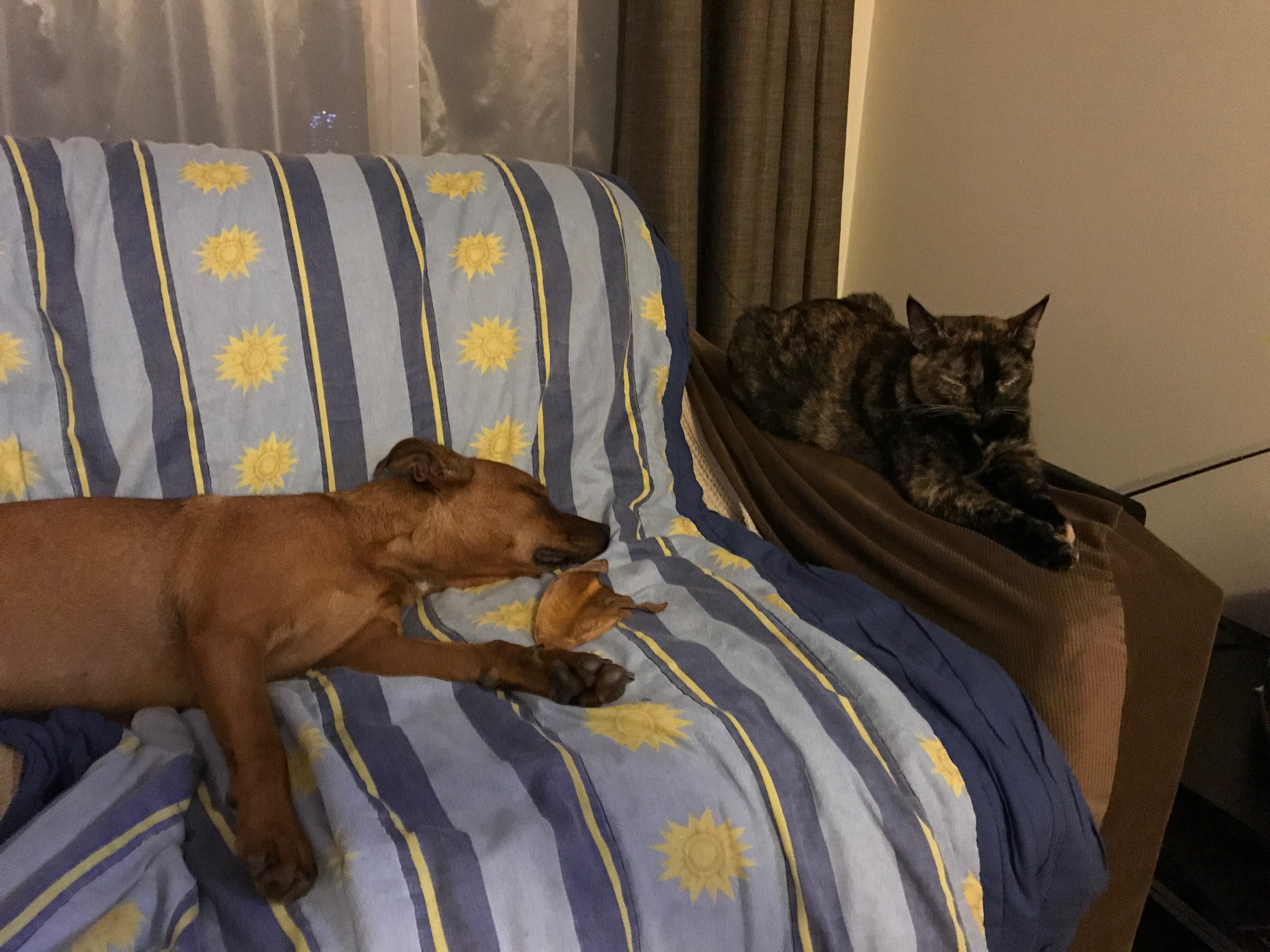 Boomer has adopted some of Starbucks style and vice versa. Their human parents often say they have a dog that thinks she is a cat and a cat that thinks she is a dog.  The girls play well together and generally Boomer initiates play, during which she does her little kitty growl, and Starbuck’s tail wags the entire time.