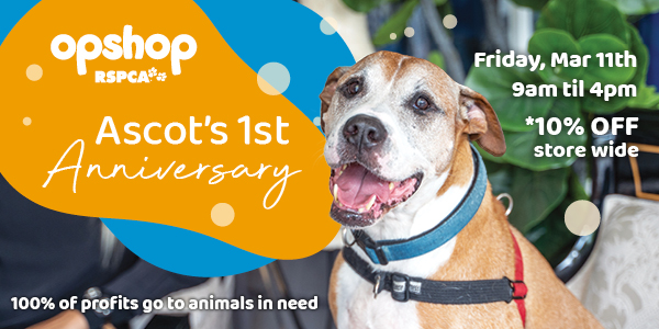 Our Ascot RSPCA Op Shop is celebrating its 1st Anniversary! On Friday 11th of March pop into our store and take advantage of the 10% Off store wide.