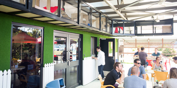 Whether it’s a quick lunch to go, your morning coffee or a sit down meal you can always see our furry friends frolicking in their play pen.